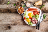 Zdjęcie "Tradycyjne ukraińskie lub białoruskie jedzenie. Śniadanie, bekon, smażone jajka i tost na starym drewnianym stole. baner, menu cateringowe miejsce na tekst, widok z góry." może być wykorzystywane do celów osobistych i komercyjnych zgodnie z warunkami zakupionej licencji Royalty-free. Obraz jest dostępny do pobrania w jakości wysokiej rozdzielczości do 5760x3840.