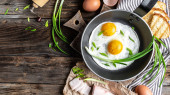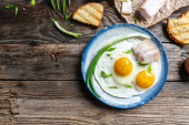 Tradycyjne ukraińskie lub białoruskie jedzenie. Śniadanie, bekon, smażone jajka i tost na starym drewnianym stole. baner, menu cateringowe miejsce na tekst, widok z góry.
