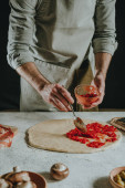 Zbliżenie cukiernik dekorowanie tort urodzinowy przy użyciu jadalnego złotego barwnika i szczotki w studio cukierniczym
