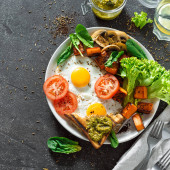 Zdjęcie "Śniadanie z quinoa, smażona dynia w plasterkach, awokado i smażone jajko. Wegetariańska, zdrowa, dietetyczna koncepcja żywności. Widok z góry, przestrzeń kopiowania" może być wykorzystywane do celów osobistych i komercyjnych zgodnie z warunkami zakupionej licencji Royalty-free. Obraz jest dostępny do pobrania w jakości wysokiej rozdzielczości do 5760x3840.