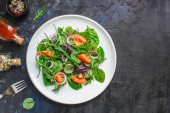 Zdjęcie "Grecka sałatka pomidor, ogórek, oliwki sałata mieszanka zielenina witaminy porcja warzyw na stole zdrowy posiłek przekąska górny widok kopiuj miejsce na tekst jedzenie tło rustykalny obraz keto lub dieta paleo" może być wykorzystywane do celów osobistych i komercyjnych zgodnie z warunkami zakupionej licencji Royalty-free. Obraz jest dostępny do pobrania w jakości wysokiej rozdzielczości do 5760x3840.
