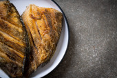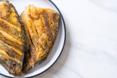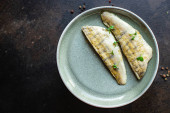 morszczuk ryby smażone świeże owoce morza drugie danie grill porcja na stole zdrowy posiłek przekąska górny widok kopiuj miejsce na tekst jedzenie tło obraz rustykalny pescetarna dieta