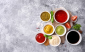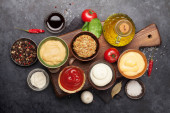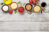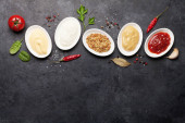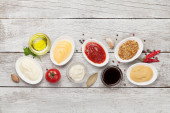 Zdjęcie "Zestaw różnych sosów. Popularne sosy w misach - ketchup, musztarda, majonez na białym drewnianym stole. Widok z góry płaski lay" może być wykorzystywane do celów osobistych i komercyjnych zgodnie z warunkami zakupionej licencji Royalty-free. Obraz jest dostępny do pobrania w jakości wysokiej rozdzielczości do 5760x3840.