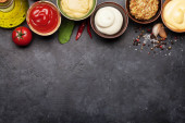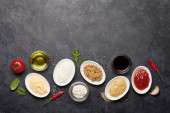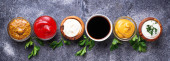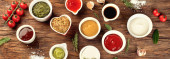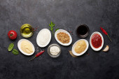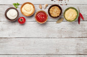 Zestaw różnych sosów. Popularne sosy w misach - ketchup, musztarda, majonez na białym drewnianym stole. Widok z góry płaski lay