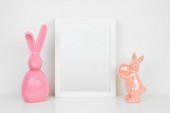 Ułóż drewnianą ramę z pisankami i nowoczesnym szklanym wystrojem króliczka na drewnianej półce. Kwadratowa rama na białym banerze ściennym. Przestrzeń kopiowania.