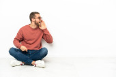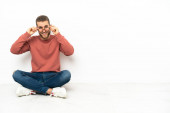 Zdjęcie "Młody przystojniak siedzi na podłodze i słucha czegoś, kładąc rękę na uchu." może być wykorzystywane do celów osobistych i komercyjnych zgodnie z warunkami zakupionej licencji Royalty-free. Obraz jest dostępny do pobrania w jakości wysokiej rozdzielczości do 5760x3840.