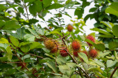 Obraz gospodarstwa Rambutant z czerwonymi dojrzałymi owocami powiesić na drzewie.