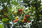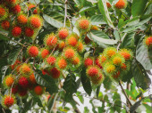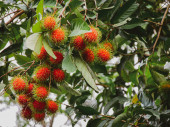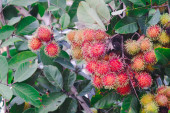 Obraz gospodarstwa Rambutant z czerwonymi dojrzałymi owocami powiesić na drzewie.