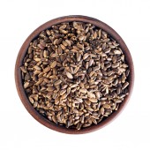 Nasiona ostropestu mlecznego w drewnianej misce, izolowane na białym tle. Marianum Silybum, Scotch Thistle lub Marian Thistle. Widok z góry.