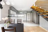 Nowoczesna kuchnia z białymi meblami, nowoczesną jadalnią i drzwiami okiennymi na balkon