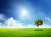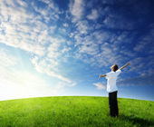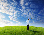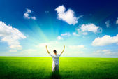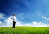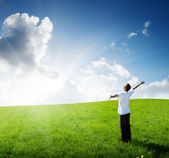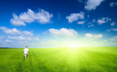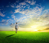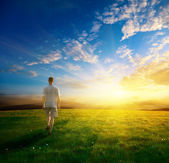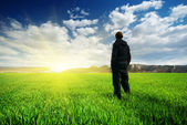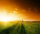 jeden człowiek i pole trawa wiosna i zachód słońca