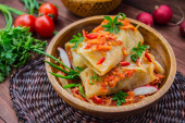 Zdjęcie "Kapusta z mięsem, ryżem i warzywami. Chou farci, dolma, sarma, golubtsi lub golabki" może być wykorzystywane do celów osobistych i komercyjnych zgodnie z warunkami zakupionej licencji Royalty-free. Obraz jest dostępny do pobrania w jakości wysokiej rozdzielczości do 5760x3840.