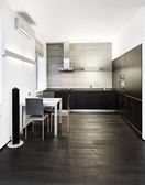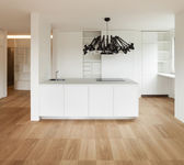 Przestronna kuchnia z drewnianą podłogą i funkcjonalna wyspa kuchnia z dwoma krzesłami