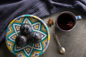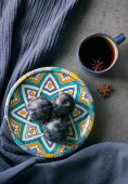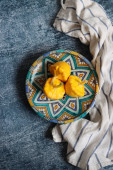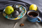 Zdjęcie "Kolorowa martwa natura z soczystymi cytrynami na niebieskim, dekoracyjnym talerzu i ceramicznym kubku. Widok z góry zdjęcie na szarym tle teksturowane. " może być wykorzystywane do celów osobistych i komercyjnych zgodnie z warunkami zakupionej licencji Royalty-free. Obraz jest dostępny do pobrania w jakości wysokiej rozdzielczości do 5760x3840.
