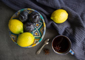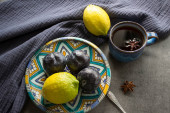 Kolorowa martwa natura z soczystymi cytrynami na niebieskim, dekoracyjnym talerzu i ceramicznym kubku. Widok z góry zdjęcie na szarym tle teksturowane.