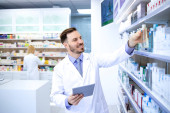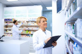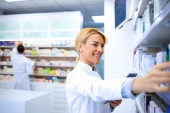 Profesjonalna farmaceutka w białym fartuchu pracująca w aptece, notująca leki na półce.