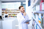 Zdjęcie "Profesjonalna farmaceutka w białym fartuchu pracująca w aptece, notująca leki na półce." może być wykorzystywane do celów osobistych i komercyjnych zgodnie z warunkami zakupionej licencji Royalty-free. Obraz jest dostępny do pobrania w jakości wysokiej rozdzielczości do 5760x3840.