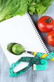 sztućce związany z pomiaru taśmę i książki z warzywami na białym tle