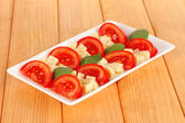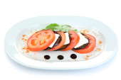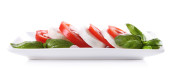 Sałatka Caprese ser mozarella, pomidory i bazylia na talerzu, na białym tle