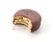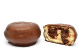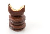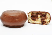 Okrągły czekoladowy placek chokopie przekąska odgryziona odizolowana na białym tle widok boku