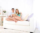 miłości para siedzi na kanapie, na tle wnętrz domu