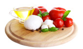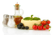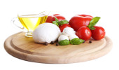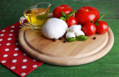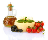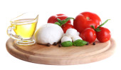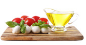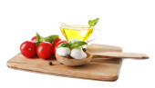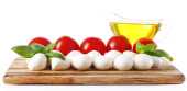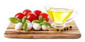 Kompozycja kulki serowe smaczne mozzarella, bazylia i czerwone pomidory, oliwy z oliwek na deski do krojenia, na białym tle