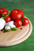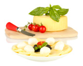 Kompozycja kulki serowe smaczne mozzarella, bazylia i czerwone pomidory, oliwy z oliwek na deski do krojenia, na białym tle