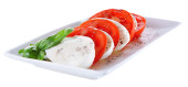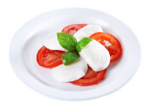 Sałatka Caprese ser mozarella, pomidory i bazylia na talerzu, na białym tle