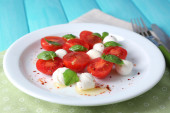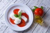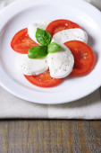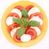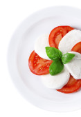 Sałatka Caprese ser mozarella, pomidory i bazylia na talerzu, na białym tle