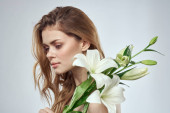 Kobieta z białym kwiatem na niebieskim tle przycięty widok nagich ramion