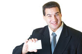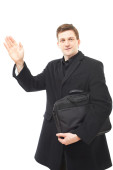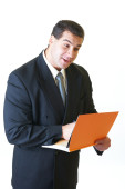 atrakcyjny mężczyzna w czarnym garniturze z orange o książki i pióra na białym tle
