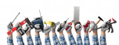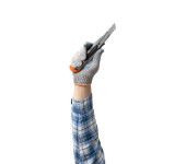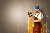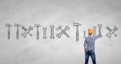 grupa rąk trzyma narzędzie konstrukcyjne do obróbki drewna i montażu i budowy mebli lub naprawy, na szarym tle ściany
