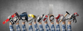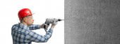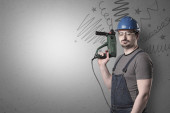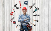 szczęśliwy pracownik złota rączka (Jack wszystkich zawodów) lub budowniczy z narzędziami budowlanymi, stoisko i uśmiech, na szarym tle betonowej ściany. Koncepcja usług remontowych i budowlanych