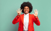 uśmiecha się i wygląda przyjaźnie, pokazuje numer siedem lub siódmy z ręką do przodu, odliczanie w dół