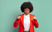 wyglądając zszokowany, zdumiony i otwarty usta, wskazując w górę z obu rąk, aby skopiować przestrzeń
