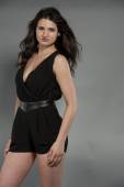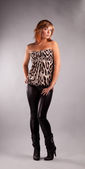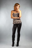 młoda kobieta w skórzanej kurtce, spódniczka mini, wysokie obcasy, z położony