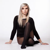 młoda kobieta w skórzanej kurtce, spódniczka mini, wysokie obcasy, z położony