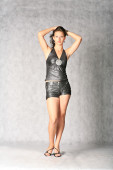 młoda kobieta w różowy gorset, dżinsy, buty na obcasie z różowy szalik
