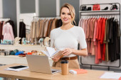 Wesoła blondynka sprzedawca przytulając różowy płaszcz na manekin w salonie