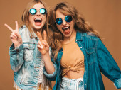 wesoły afrykański amerykański dziewczyna wystające z języka podczas noszenia strony okulary z przyjacielem odizolowany na szary