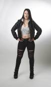 młoda kobieta w czerwonej koszuli, nowoczesną kurtkę, legginsy z otworami, ponownie