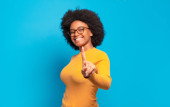 uśmiechając się i wyglądając przyjaźnie, pokazując numer jeden lub pierwszy z ręką do przodu, odliczając w dół