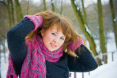 uśmiechający się ładna dziewczyna w czerwonym płaszczu