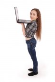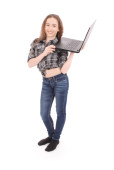 dziewczyna trzyma Czerwonej Księdze i wygląda w laptopie. na białym tle