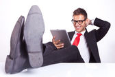Zdjęcie "człowiek biznesu rozluźnia z tabletem w ręku" może być wykorzystywane do celów osobistych i komercyjnych zgodnie z warunkami zakupionej licencji Royalty-free. Obraz jest dostępny do pobrania w jakości wysokiej rozdzielczości do 5760x3840.