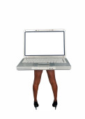 piękny młody gospodyni brunetka z urzekającym uśmiechem, wygląda bezpośrednio w przeglądarce podczas punktowanie do laptopa, który wyświetla pusty ekran niebieski.