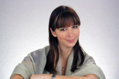 piękne Młoda kobieta brunetka wygląda bezpośrednio w przeglądarce z urzekającym uśmiechem, trzymając filiżankę kawy lub herbaty.