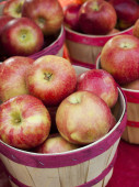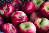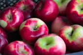 czerwony dojrzałe jabłka ekologiczne w wiklinowym koszu
