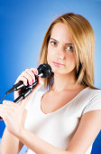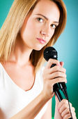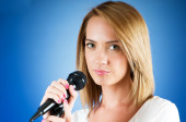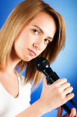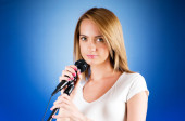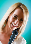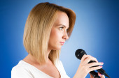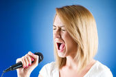 Girl singing with microphone against gradient background