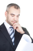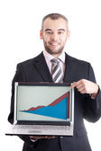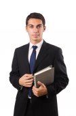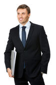 młody biznesmen z laptopa na białym tle na biały i stałego